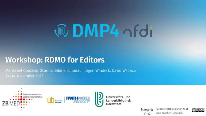 Preview ImageDMP4NFDI held the hands-on online workshop “RDMO for Editors” on 13 and 14 November 2025. The workshop was based on the newly developed Train-the-Trainer concept for DMPs and RDMO, and marked the first test of the Advanced Level of the RDMO module. This level focuses on hands-on usage and familiarisation with the RDMO interface from an editor’s perspective as well as working with the NFDI DMP Template Framework.