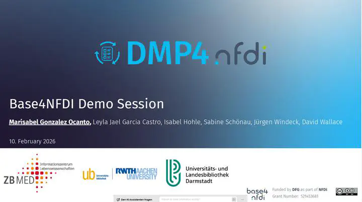 The Basic Service DMP4NFDI hosted the first “Base4NFDI Demo Session”. In this presentation, DMP4NFDI showed NFDI consortia how to build a DMP or SMP service for their communities. Participants learned how to:
